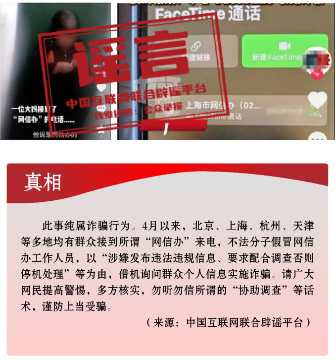 冒用官方名义造假行骗,损害群众利益。4月以来,一些不法分子冒用国家机关名义、假扮相关工作人员,编造诈骗“话术剧本”,企图行骗牟利。如全国多地有群众接到所谓“网信办”来电,不法分子假冒网信办工作人员,以“群众手机涉嫌违法违规、要求配合调查否则停机处理”等为由,借机询问群众个人信息实施诈骗。另有网传民政部养老服务司开展“颐养家园建设”“个人普惠养老金方案”等所谓“官方行为”,实际上均系不法分子实施的违法诈骗行为;“养老保险断缴3个月待遇清零”“单次住院不超过15天”等假消息以讹传讹,歪解国家医保政策,损害群众合法权益。