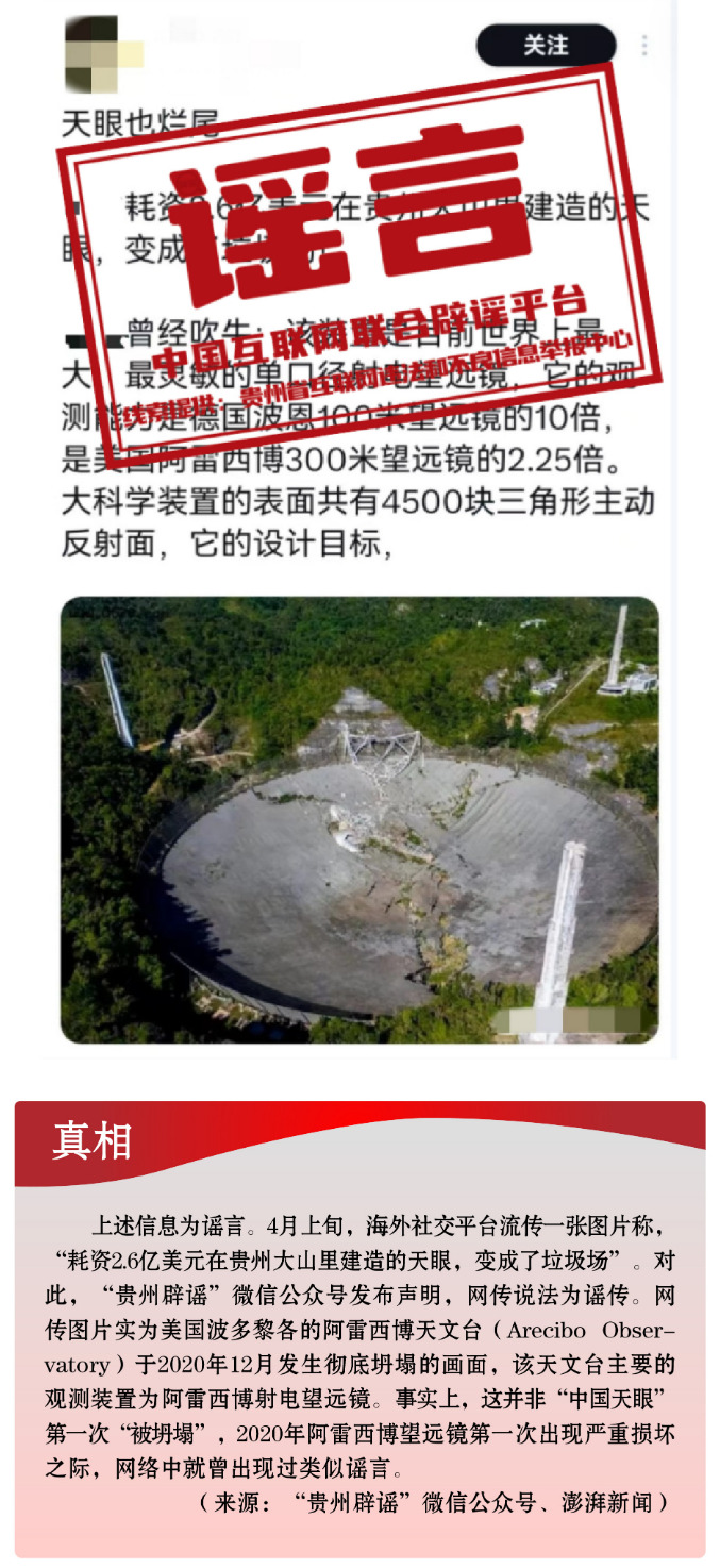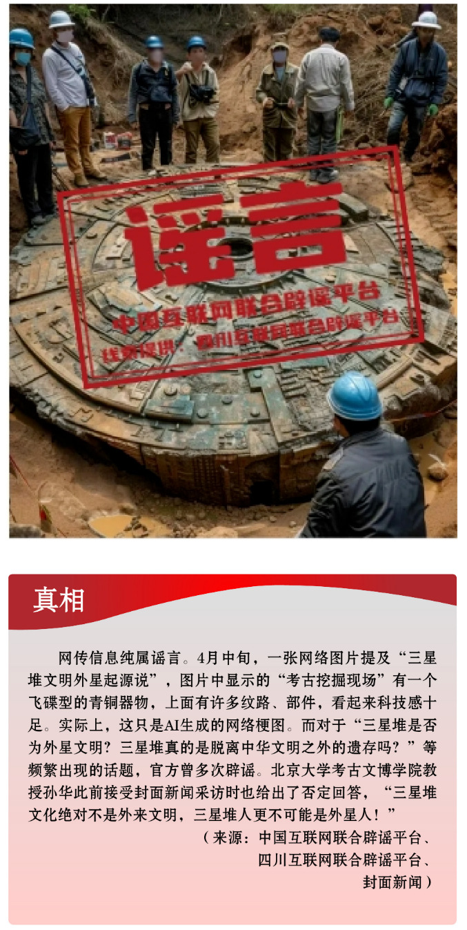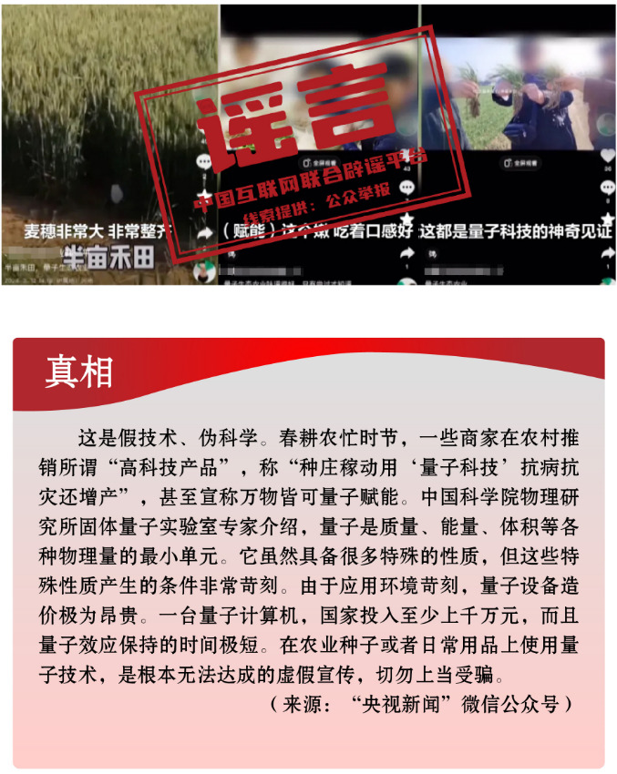 利用科技概念制造噱头,误导公众认知。4月,涉及天文、文物、健康、环保、农业、教育等诸多领域的假科技、伪科学信息流传于网上,造谣传谣者利用人们对新技术的好奇和向往心理,或夸大其词、或扭曲事实、或利用AI凭空编造,企图蒙蔽群众、牟取私利。比如,“中国‘天眼’变成垃圾场”纯属张冠李戴,“三星堆挖出酷似‘飞碟’青铜器”完全由AI合成,“福州福飞北路核辐射超标”则更是博取眼球的恶意炒作,扰乱广大群众的正确认知与理性判断。还有一些商家为带货牟利,利用伪科学炒概念,宣称“量子赋能农作物,抗病抗灾还增产”“‘体考神器’喝一口就能及格”,损害公众利益,社会影响恶劣。此外,在食品健康领域,诸如“食用蜂蜜或花粉防过敏”“鸡蛋煮老后有层‘黑膜’,吃了会致癌”等说法流传,让人将信将疑,实则都是不符合科学、不利于健康的说法。