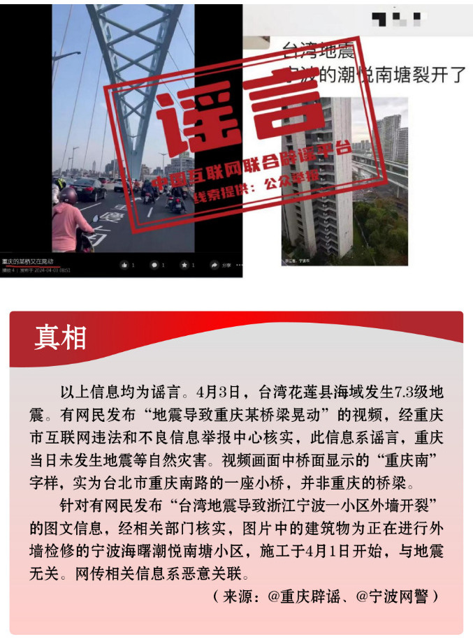台湾7.3级地震导致重庆某桥梁晃动、浙江宁波一小区外墙开裂?