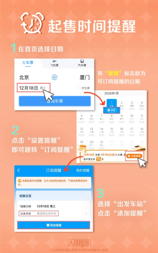 打开铁路12306App—首页选择日期—选择要购票日期—点击“设置提醒”,即可跳转“订阅提醒”—选择“出发车站”后,点击“添加提醒”即可。