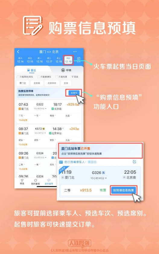 在车票起售当日,预先填写乘车人、车次、席别等信息,在车票开始发售时,一键提交订单即可。