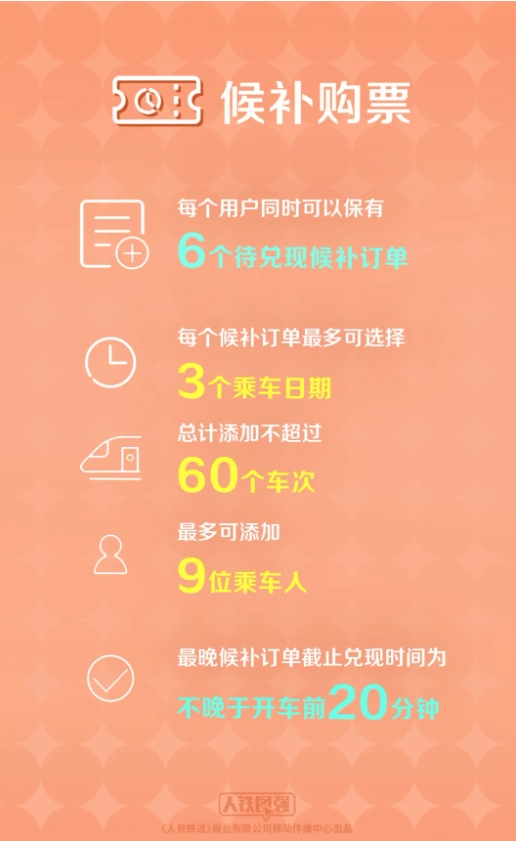 每个用户可以有6个待兑现候补订单,每个候补订单最多可选择3个乘车日期,总计添加不超过60个车次。