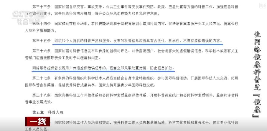 2024年12月25日,十四届全国人大常委会第十三次会议表决通过了新修订的科学技术普及法,其中规定,组织和个人提供的科普产品和服务、发布的科普信息应当具有合法性、科学性,不得有虚假错误的内容。网络服务提供者发现用户传播虚假错误信息的,应当立即采取处置措施,防止信息扩散。