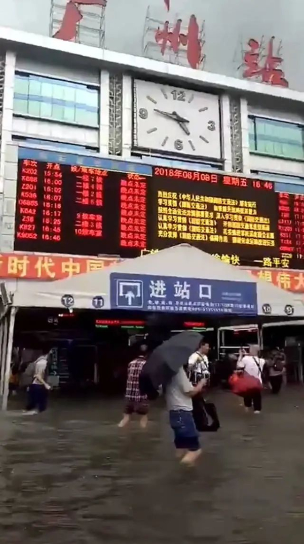 记者发现,该视频里有大量各地的洪水画面,其中有关高铁站被淹的画面是广州站的站前广场。画面显示,有多位游客站在积水中,积水深处齐膝盖深。