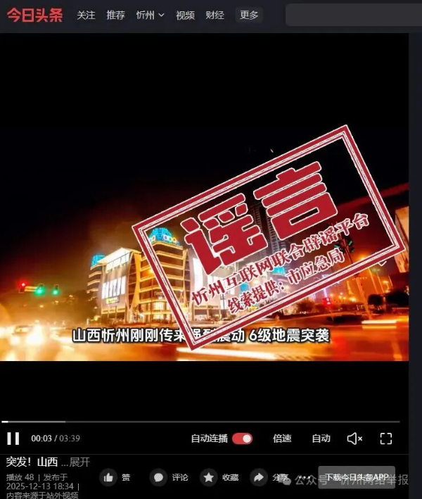 12月13日,有网民发布“突发!山西忻州遭遇6级地震,多地震感强烈”等不实信息,引发网民关注。