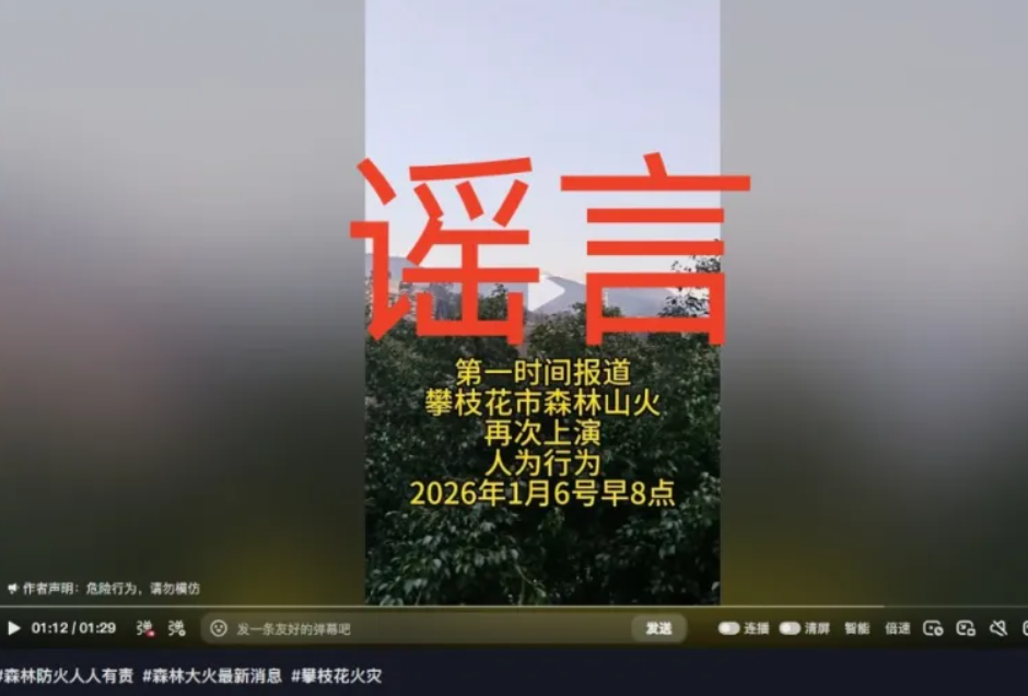 2026年1月6日,攀枝花网警巡查发现,有网民在抖音平台发布视频称“攀枝花市森林山火再次上演”。经公安机关查实,该时段攀枝花市境内未发生森林山火,该处山上的浓烟是因为开展防火隔离带计划烧除工作产生的。该视频系攀枝花市东区网民陈某某在看到山上的浓烟后,以为是发生了山火,出于博取关注的心态,将拍摄的视频在抖音平台发出,并配文字“第一时间报道 攀枝花市森林山火再次上演 人为行为 2026年1月6号早8点”,该信息为不实言论。陈某某对发布不实信息的行为供认不讳,东区公安分局依法对陈某某予以批评教育。