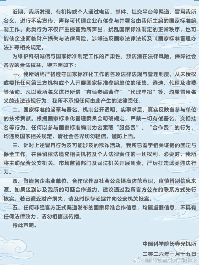 近期,有机构或个人冒用中国科学院长春光机所名义,开展有偿代理国家标准编制署名的不实宣传。对此,长春光机所发布《郑重声明》,从未授权或委托任何第三方机构或个人开展国家标准参编单位的征集、遴选、代理及收费等活动;任何以参与国家标准编制为名索取“服务费”“合作费”的行为,均违反国家相关规定。目前已着手相关证据的固定与保全工作,并保留依法追究相关机构及个人法律责任的一切权利。提醒社会公众提高防范意识,审慎辨别信息来源。任何非经官方正式渠道发布的国家标准合作信息,均属虚假信息。
