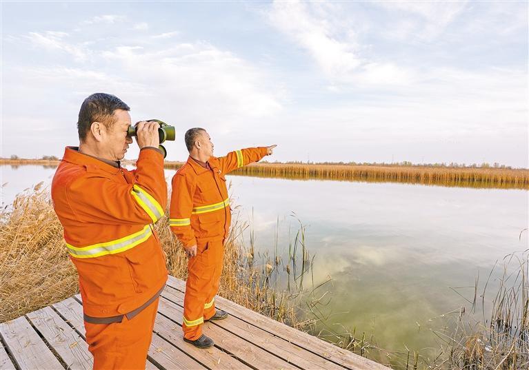 11月11日,工作人员在宁夏平罗天河湾国家湿地公园内观察候鸟。