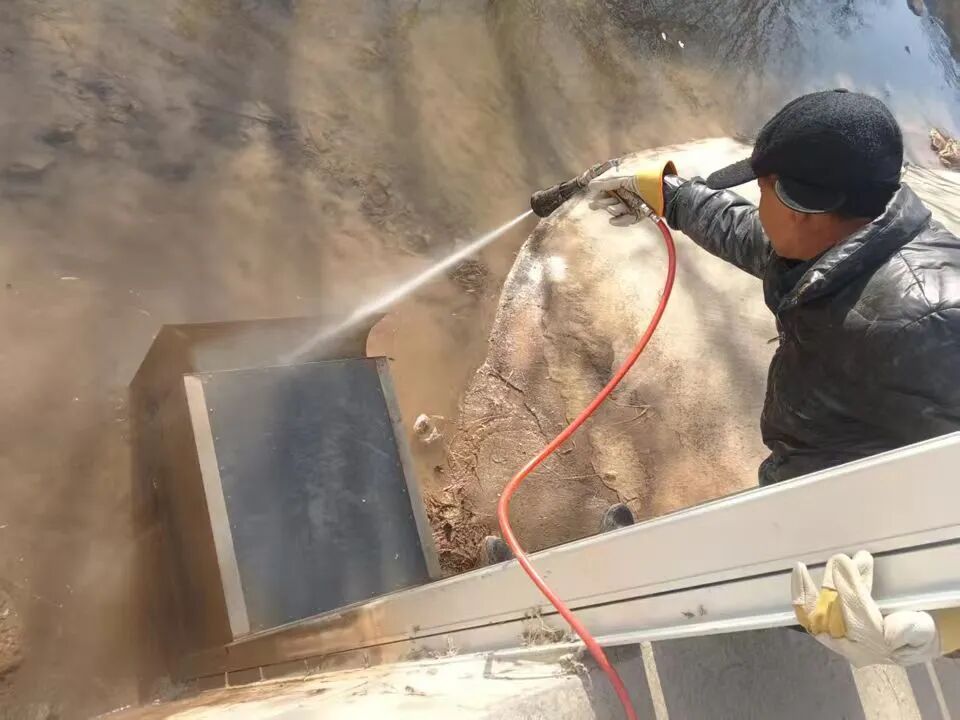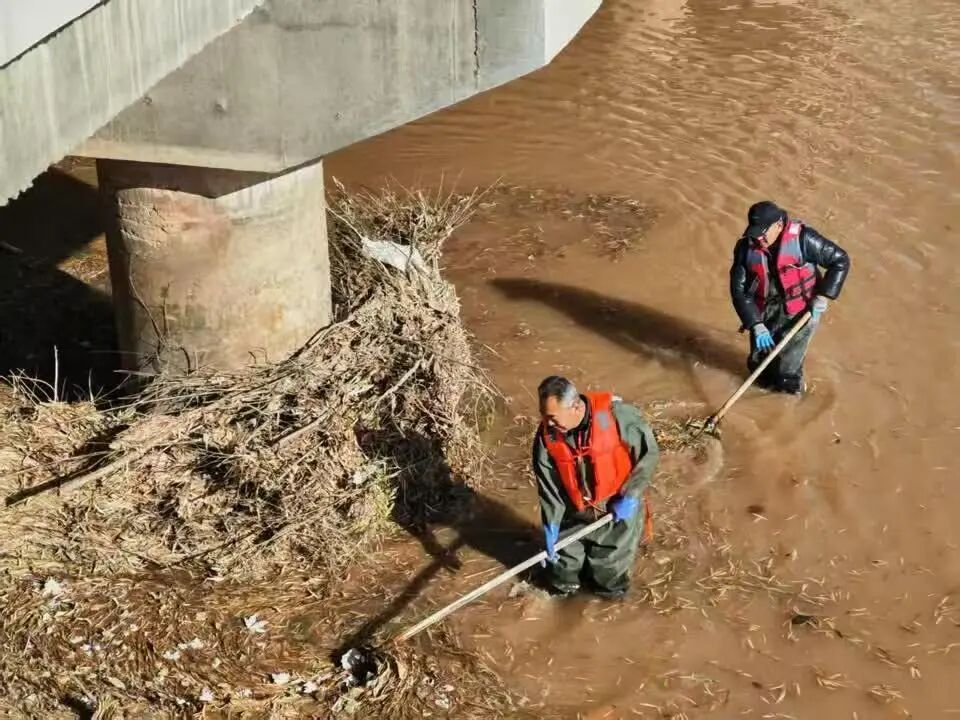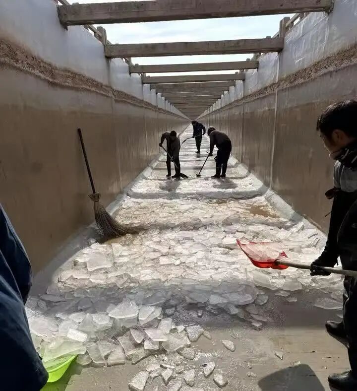 冬灌结束,为防止渠道和渡槽冻胀,固海扬水管理处职工清理其中冰层