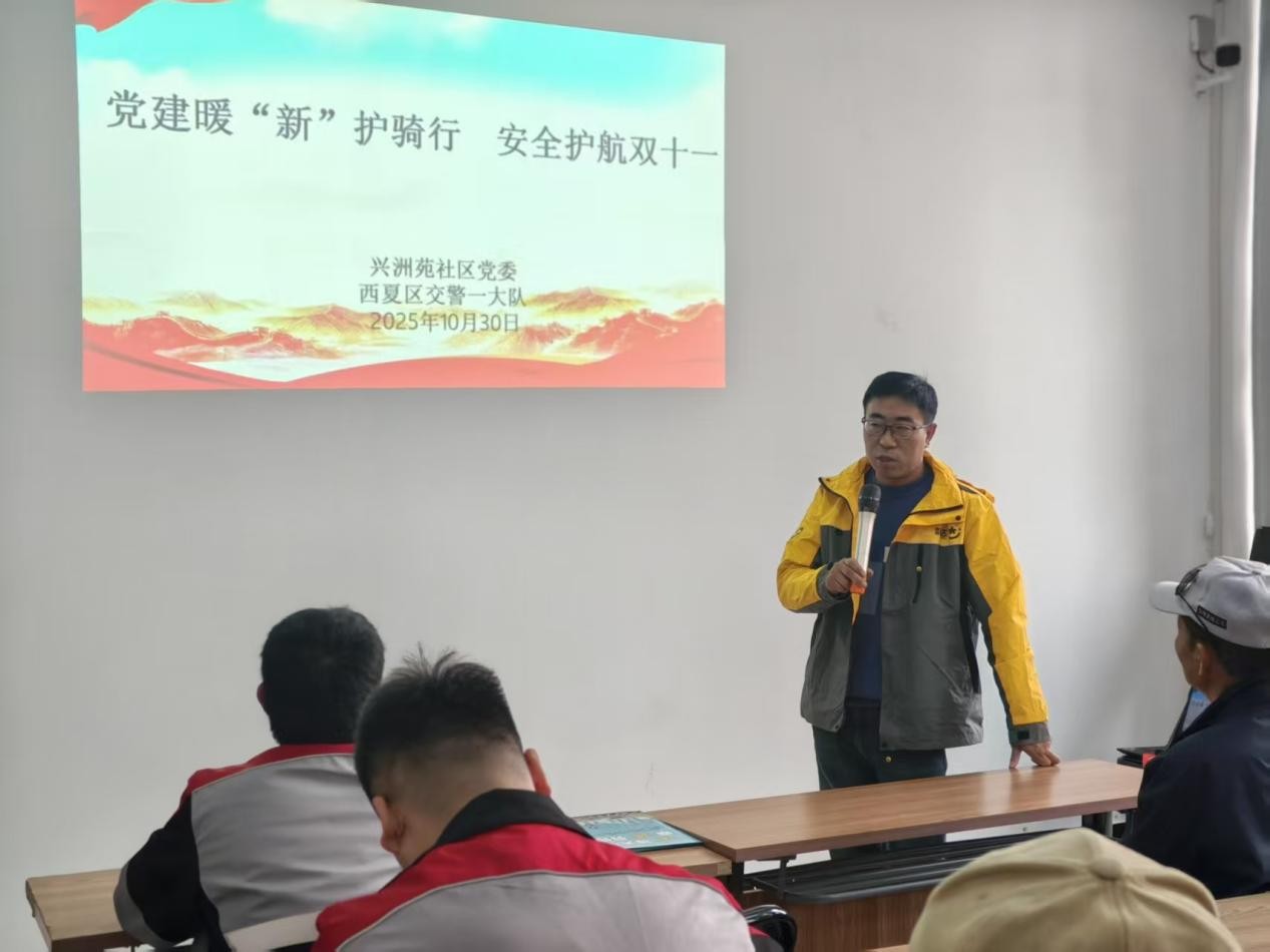 近日,银川市西夏区西花园路街道兴洲苑社区以党建为引领,组织开展“党建暖‘新’护骑行,安全护航双十一”主题活动,邀请西夏区交警一大队警官走进社区,把“安全课”“暖心礼”“健康服务”打包送到新就业群体身边,让新就业群体感受到党组织的关怀与温暖。