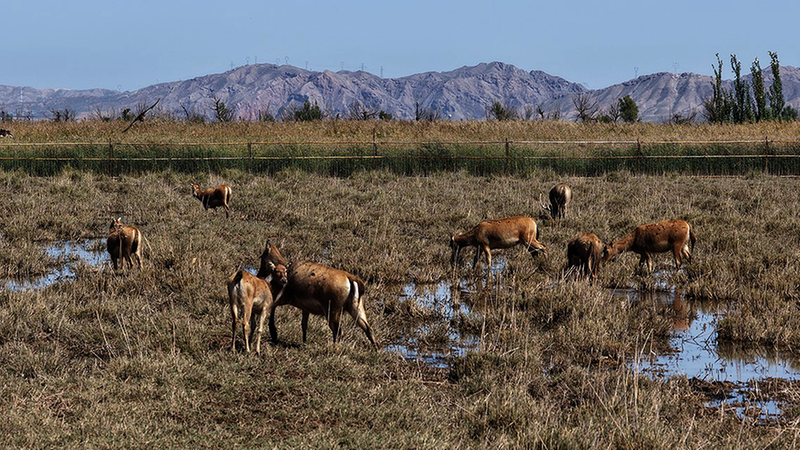 在青铜峡库区湿地自然保护区,麋鹿在觅食(摄于2025年11月3日)。