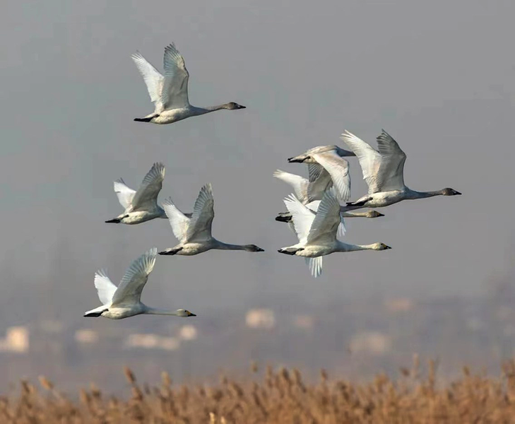 在吴忠黄河国家湿地公园飞翔的天鹅(资料图片)。