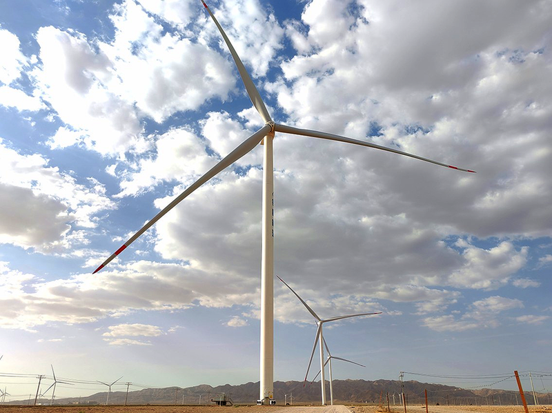 风力发电机与蓝天白云相映成景,构成一幅美丽的生态画卷(摄于2025年6月24日)。