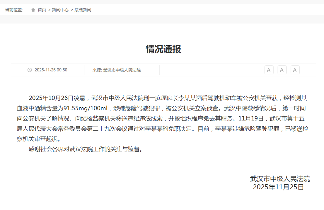 2025年10月26日凌晨,武汉市中级人民法院刑一庭原庭长李某某酒后驾驶机动车被公安机关查获,经检测其血液中酒精含量为91.55mg/100ml,涉嫌危险驾驶犯罪,被公安机关立案侦查。