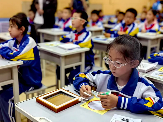 当天下午,采访团抵达首站彭阳县。图为彭阳三小同学制作麦秆画非遗法治文创作品。