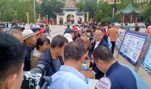 彭阳县“网络安全宣传周”集中宣传活动现场,工作人员向群众发放法治文创日用品,普及法律知识。