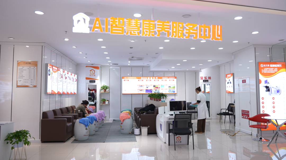 六楼除日用床品、电器外,文创中心是商场里的一大亮点。这里定期举办扎染、剪纸、非遗项目体验等老年活动。周末还会开设“暖心课堂”,联合书法协会组织老年人作画,大家围坐交流技法、分享作品,氛围轻松热闹;此外,文创中心还摆放免费书籍供老年人闲逛时阅读。同层的智慧养老中心与四楼AI智慧康养形成互补,这里以中医理疗为特色,设有中医坐诊、艾灸、泥灸等服务,配备专业的中医理疗房,包括针灸室、推拿室、艾灸室。定期举办的中医门诊,让老年人可以免费体验问诊、测量血压血糖、经脉疏通、泡脚等服务。同时还配备按摩椅、呼吸机等适老化设备和保健品专区,并增设睡眠房供老年人休憩,真正实现一站式康养体验。