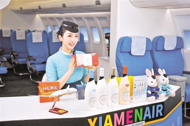 “这是来自宁夏的葡萄酒……”厦门航空的直播室里,空乘化身带货主播推荐着宁夏特产。