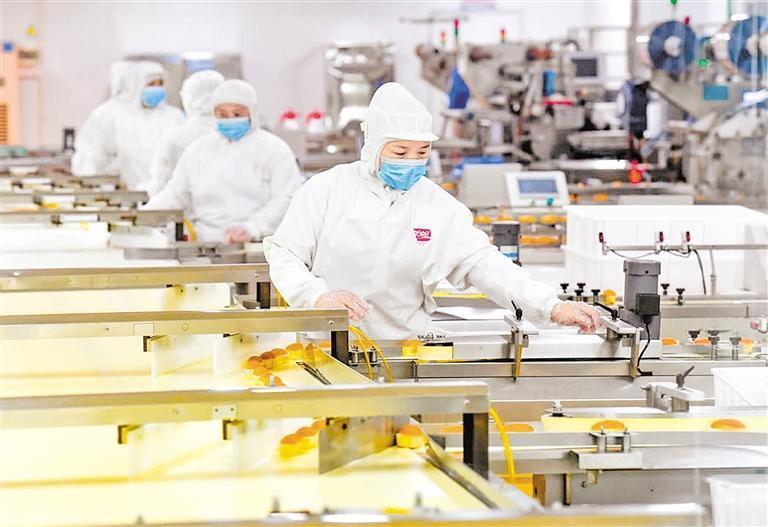 进入生产车间,现代化的生产设备处处体现着科技的力量。“我们采用的自动化生产线,从和面到装箱入库,实现全过程人工零接触。”盼盼食品工作人员介绍。