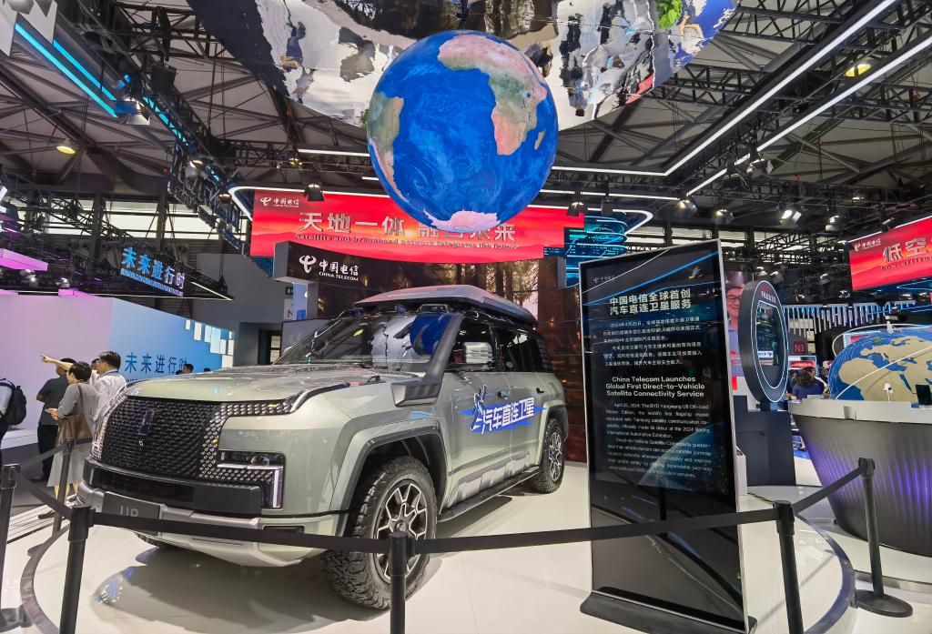 6月26日在中国电信展台拍摄的汽车直连卫星服务介绍。新华社记者 陈爱平 摄