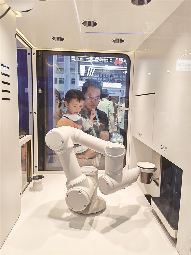 不远处的“金牌咖啡师”——双臂拉花机器人展位前,同样被围得水泄不通。90秒就能出品一杯“静谧天鹅”拉花咖啡,日均稳定输出300杯,效率抵得上人工连续工作15个小时。“以往只在咖啡店看过咖啡师手工拉花,今天亲眼见到机器人也能完成得这么细腻,太神奇了!”观众乔娜举着刚做好的拉花咖啡打卡拍照,将这份“科技+美食”的新奇体验晒到朋友圈。