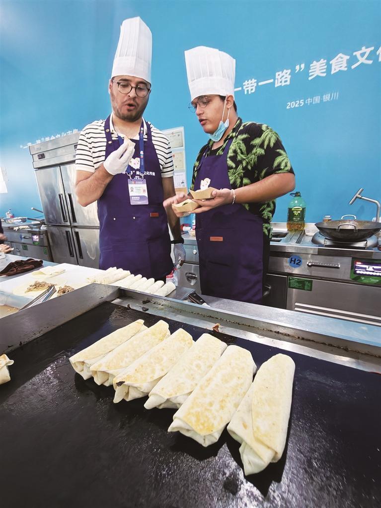 这场市集也成了游客的“必逛清单”。福建游客刘旭正带家人在银川旅游,听闻博览会举办,特意赶来打卡:“一方水土养一方人,有些美食口味虽不太习惯,但这种跨国界的味觉体验,实在难得。”来自吴忠的蒋晓宁尝过约旦拌饭后,眼前一亮:“这味道跟咱宁夏的肉臊子拌饭挺像,吃着合胃口。”来自石嘴山的陈怡荷对乌兹别克斯坦美食“圆包菜牛肉卷”赞不绝口,连说“好吃好吃”。从内蒙古阿拉善左旗专程赶来的崔浩,一口气尝遍格鲁吉亚煎蛋、也门倒扣饭、巴基斯坦鸡肉卷饼等多国美食。他笑着总结道:“共建‘一带一路’国家的美食,大多以牛肉、鸡肉、土豆为主要食材,跟西北人的饮食习惯挺贴近,调味常用胡椒、洋葱、咖喱,整体吃下来都能适应。”