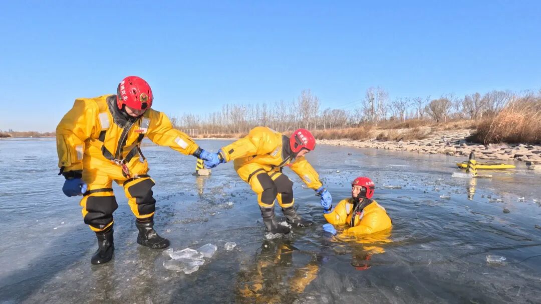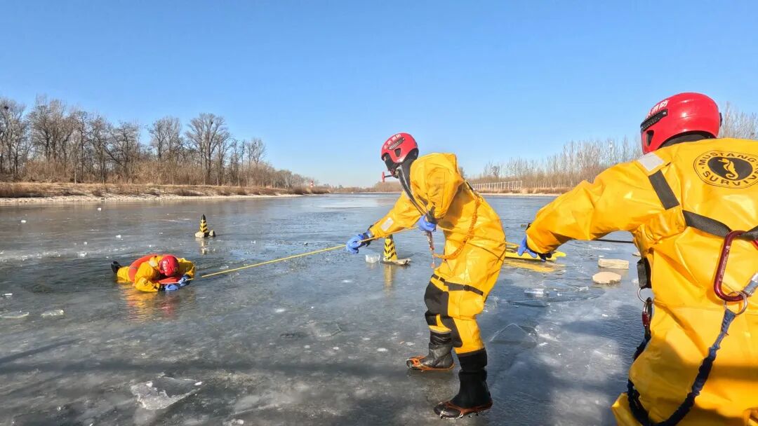 错误的施救方式:站在冰面手拉手救援很危险,容易导致连环落水。因为落水人员凭借强大求生本能,会使出全力抓住施救人员,极易将他人一同拉下水。