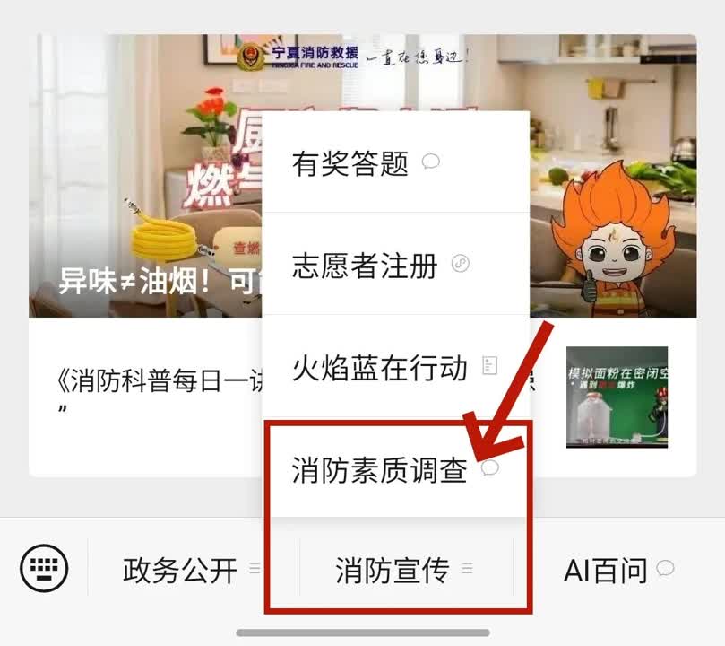 参与方式一:微信搜索“宁夏消防”公众号,点击进入公众号页面,按照图示进入调查页面。